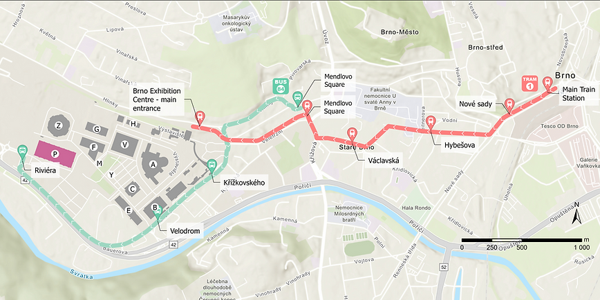 From Brno Main Railway Station (Hlavní nádraží), take tram no. 1 (direction Ečerova) and get off at Mendlovo náměstí.